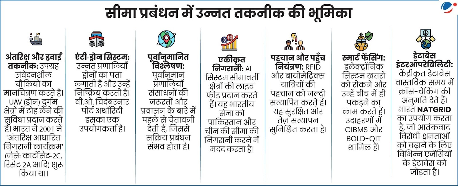 हाल ही में, केंद्रीय गृह मंत्री ने सीमावर्ती क्षेत्रों में शत्रुओं द्वारा उत्पन्न नई चुनौतियों का प्रभावी ढंग से सामना करने के लिए उन्नत तकनीकी समाधानों को अपनाने की आवश्यकता पर बल दिया।