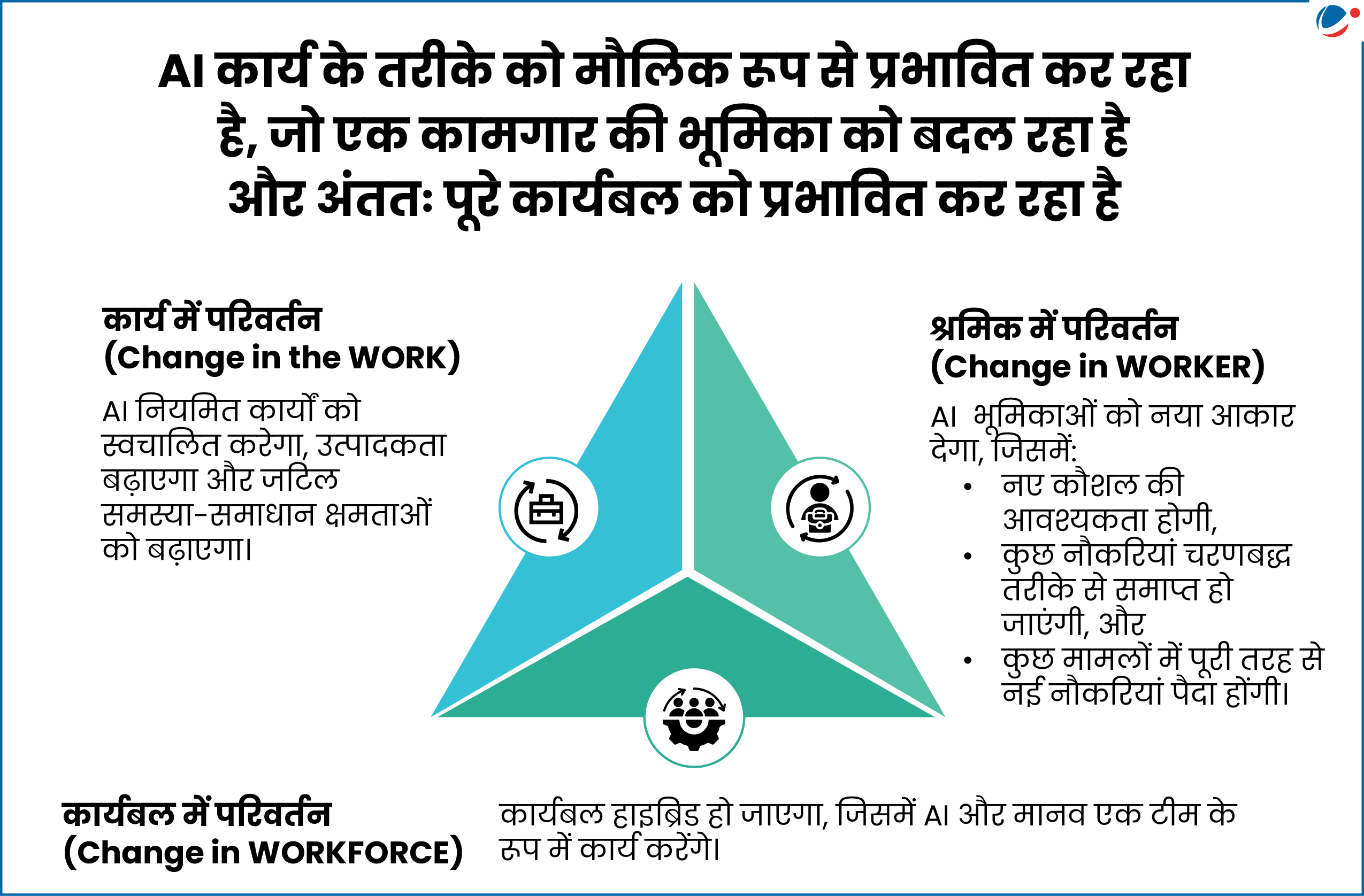 - यह व्यापक रोडमैप कार्य-कामगार-कार्यबल (Work-Worker-Workforce) के परिप्रेक्ष्य का उपयोग करता है। यह दर्शाता है कि भारत कैसे व्यवधान (disruption) को अवसर में बदल सकता है और दुनिया की AI वर्कफोर्स कैपिटल बन सकता है।