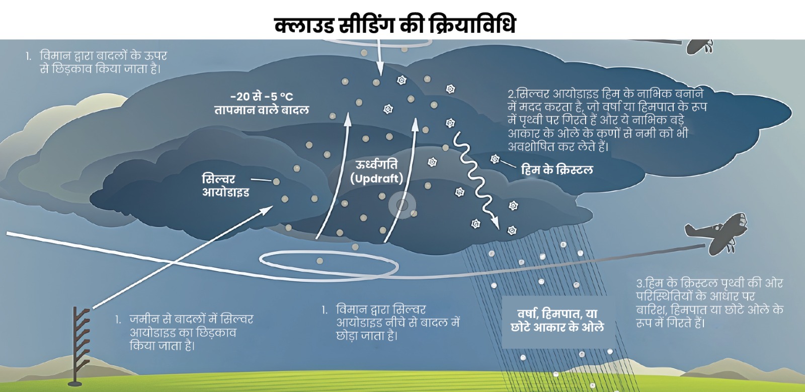- कार्यप्रणाली: हिम के नाभिकों को विमान द्वारा और/ या भूमि-आधारित जनरेटरों द्वारा बादल में छोड़ा जाता है। इससे हिमकण बनने के लिए आधार उपलब्ध हो जाता है।