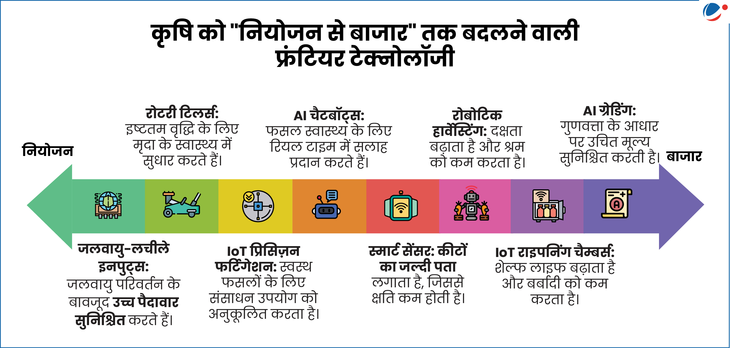 - फ्रंटियर तकनीकों में बीज तकनीक, वर्टिकल फार्मिंग, डिजिटल ट्विन्स, प्रिसीजन टूल्स और स्मार्ट सेंसर, एजेंटिक AI, प्रेडिक्टिव एनालिटिक्स और उन्नत मशीनीकरण शामिल हैं। इनका उद्देश्य उत्पादकता बढ़ाना, सतत कृषि को प्रोत्साहित करना और किसानों की आय में वृद्धि करना है।