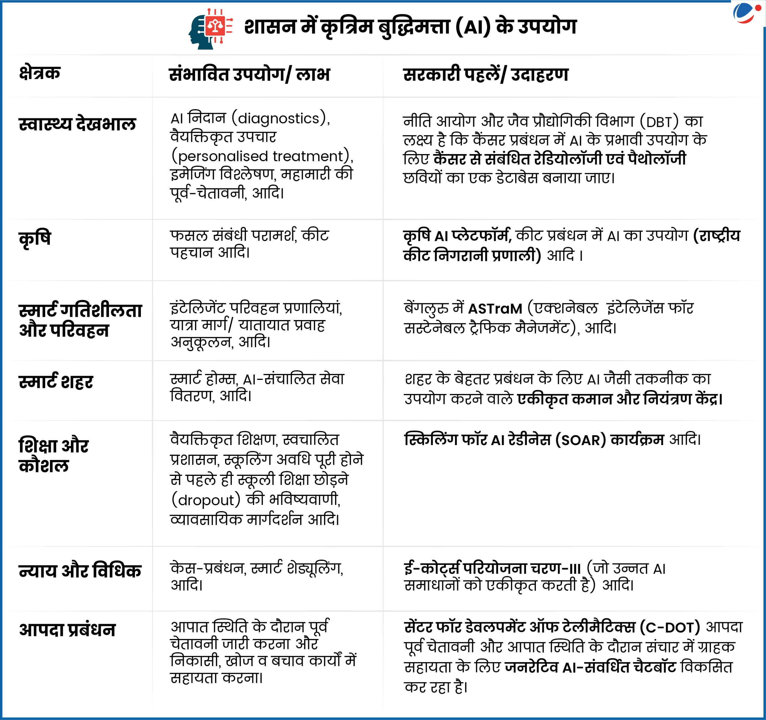 एआई पारदर्शिता और प्रभावशीलता के लिए डेटा का विश्लेषण करके नीति निर्माण को बढ़ाता है, तथा नवीन अनुप्रयोगों के माध्यम से स्वास्थ्य सेवा, कृषि, स्मार्ट शहरों, शिक्षा, न्याय और आपदा प्रबंधन जैसे क्षेत्रों का समर्थन करता है।