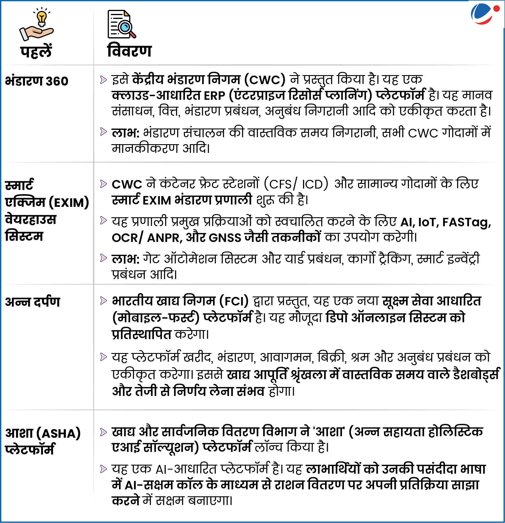 केंद्रीय उपभोक्ता मामले, खाद्य एवं सार्वजनिक वितरण मंत्री ने भंडारण संचालन को आधुनिक बनाने, आपूर्ति श्रृंखला दक्षता में सुधार लाने और सार्वजनिक वितरण प्रणाली (PDS) में पारदर्शिता बढ़ाने के लिए प्रमुख डिजिटल पहलों की शुरुआत की।