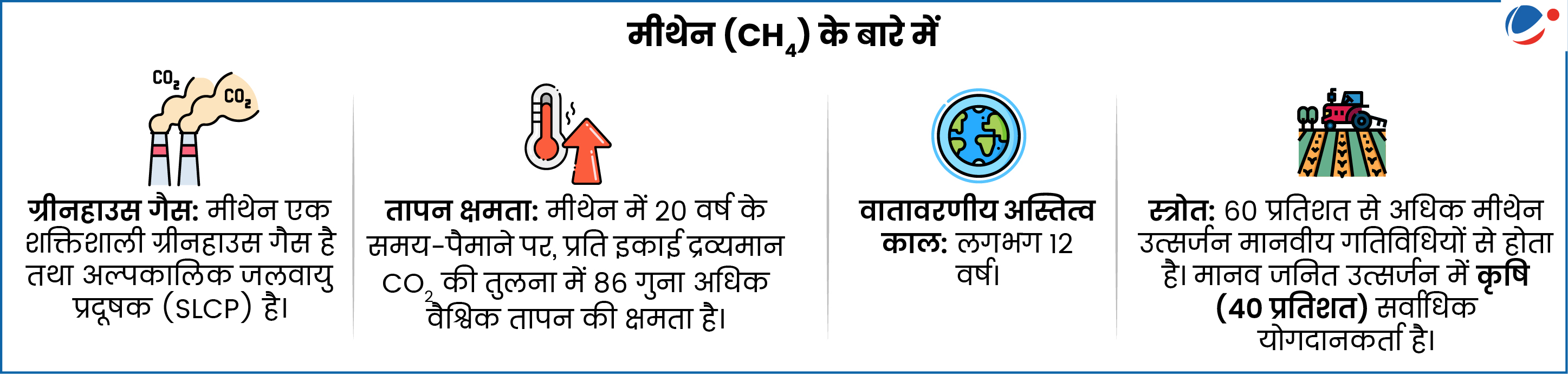 - भारत का मामला: भारत चीन और संयुक्त राज्य अमेरिका के बाद विश्व का तीसरा सबसे बड़ा मीथेन उत्सर्जक है। यह वार्षिक लगभग 31 मिलियन टन मीथेन का उत्सर्जन करता है। भारत में मुख्य रूप से पराली जलाने से अधिक मीथेन उत्सर्जन होता है।