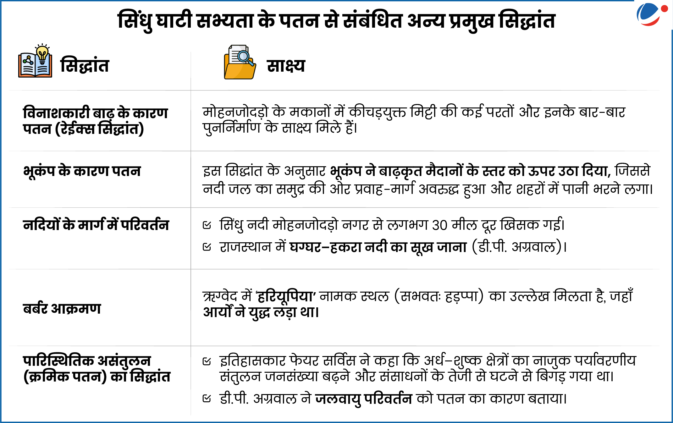 - अन्य कारक: खाद्य आपूर्ति में कमी, शासकीय संरचना कमजोर होना जैसे कारकों ने भी सिंधु घाटी सभ्यता के पतन की प्रक्रिया को तेज किया।