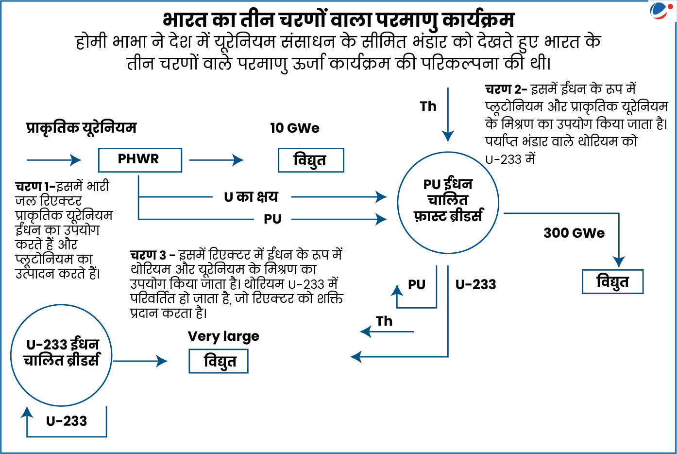 - भारत ने एक त्रि-चरणीय परमाणु ऊर्जा कार्यक्रम अपनाया है (इन्फोग्राफिक देखें)।