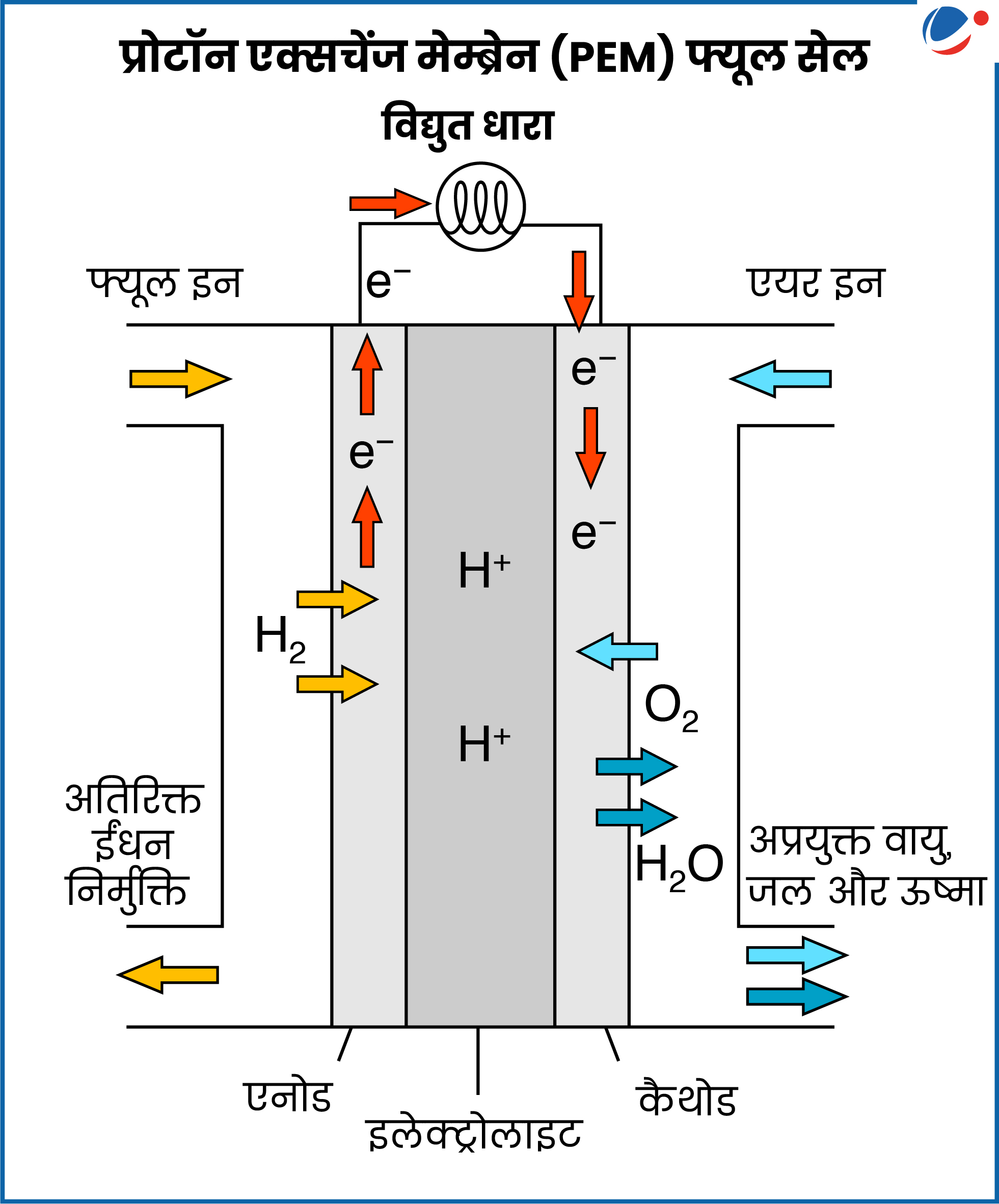 - ‘प्रोटॉन + इलेक्ट्रॉन + ऑक्सीजन’ कैथोड पर संयोजित होकर जल और आंशिक मात्रा में ऊष्मा बनाते हैं।