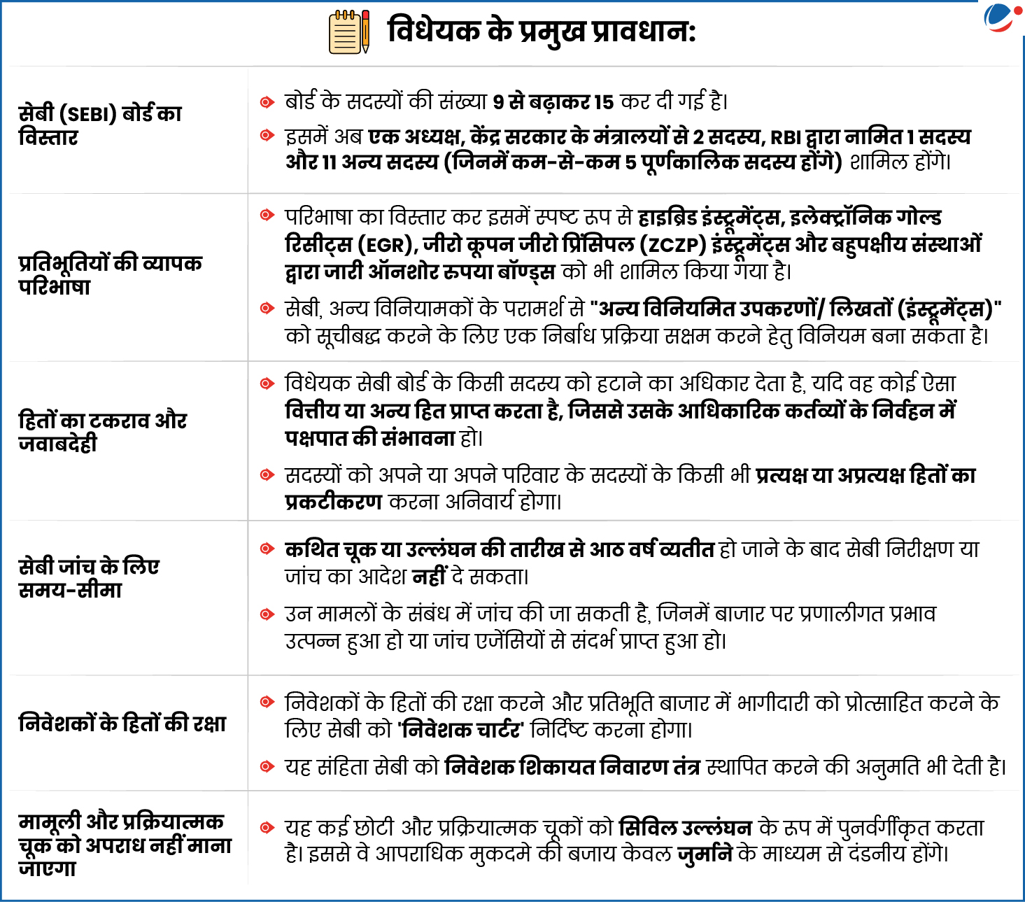 यह विधेयक भारत के प्रतिभूति बाजारों को शासित करने के लिए निम्नलिखित अधिनियमों के प्रावधानों को एक तर्कसंगत और एकल 'प्रतिभूति बाजार संहिता' में समेकित करता है-