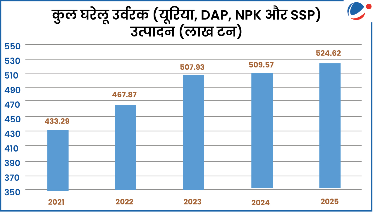 • रिकॉर्ड उत्पादन: कुल घरेलू उत्पादन (यूरिया, DAP, NPKs और SSP) 2025 में 524.62 लाख मीट्रिक टन (LMT) तक पहुंच गया।