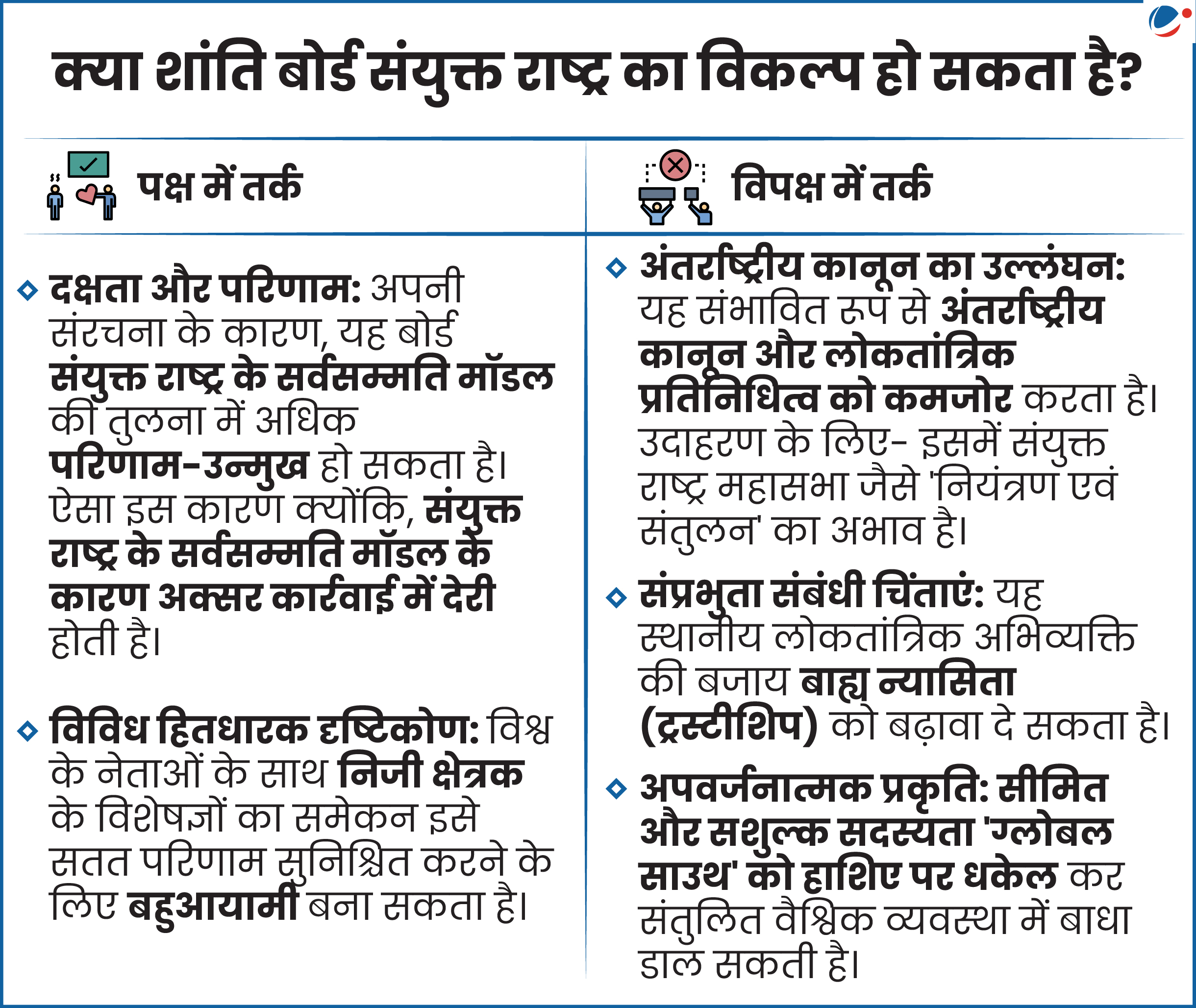 शांति बोर्ड को गाजा और मध्य-पूर्व में इसकी भूमिका से परे, वैश्विक संघर्षों को समाप्त करने के एक नए दृष्टिकोण के रूप में देखा जा रहा है। इसे सार्वभौमिक बहुपक्षवाद की बजाय 'मिनिलैटरल' (लघु-पक्षीय) और नेता-केंद्रित संस्थाओं की ओर एक बदलाव के रूप में देखा जा सकता है।