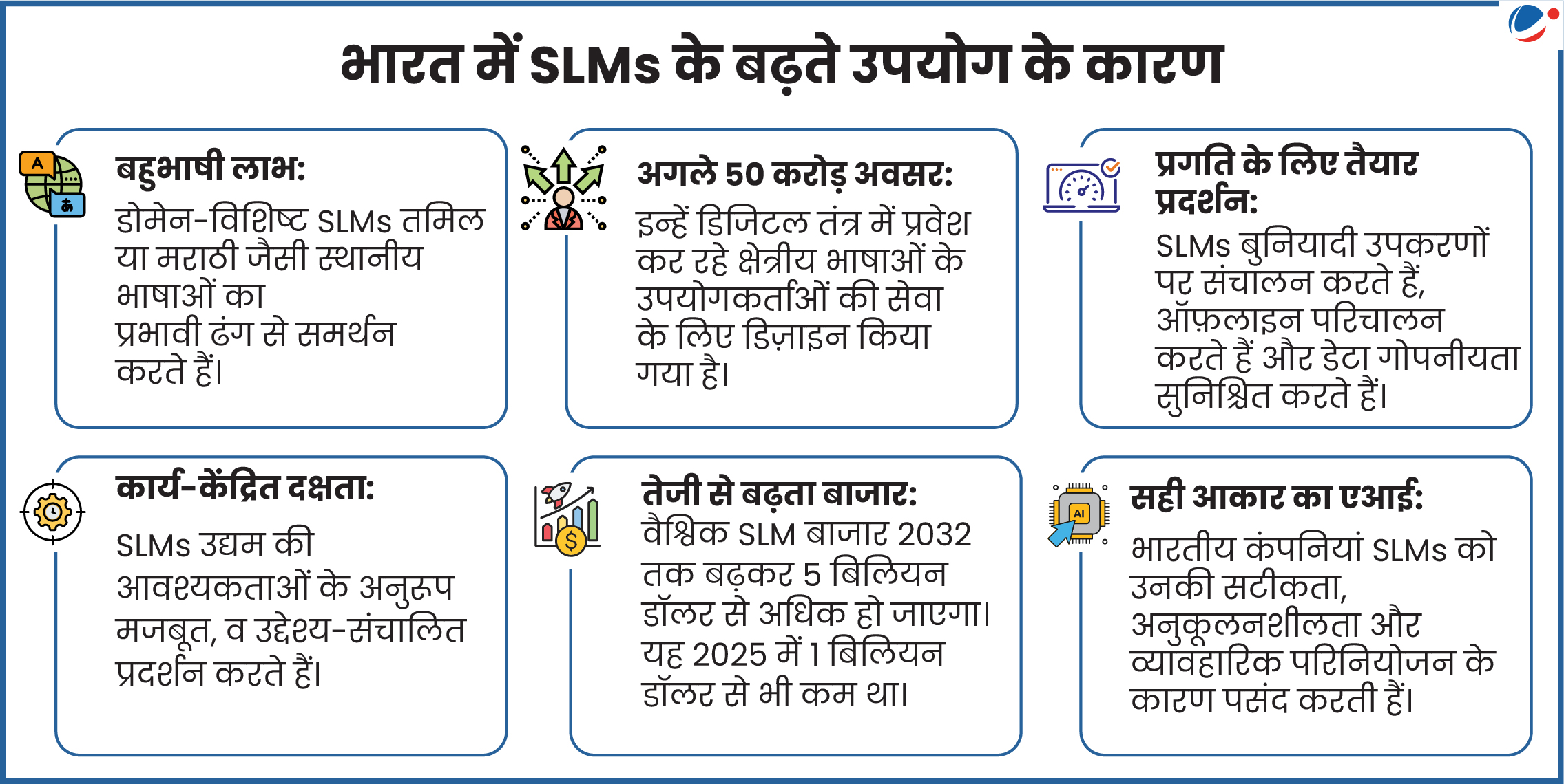 - वर्तमान स्थिति: वर्तमान में वैश्विक स्तर पर AI का लगभग 95% कार्य SLMs द्वारा ही नियंत्रित किया जा रहा है।