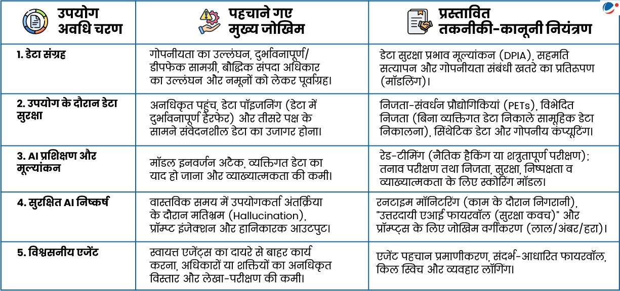 - उपयोग अवधि-आधारित गवर्नेंस: सुरक्षा उपाय डेटा संग्रह और प्रशिक्षण से लेकर तैनाती व उपयोग तक पूर्ण AI उपयोग अवधि में कार्य करते हैं। (इन्फोग्राफिक देखें)