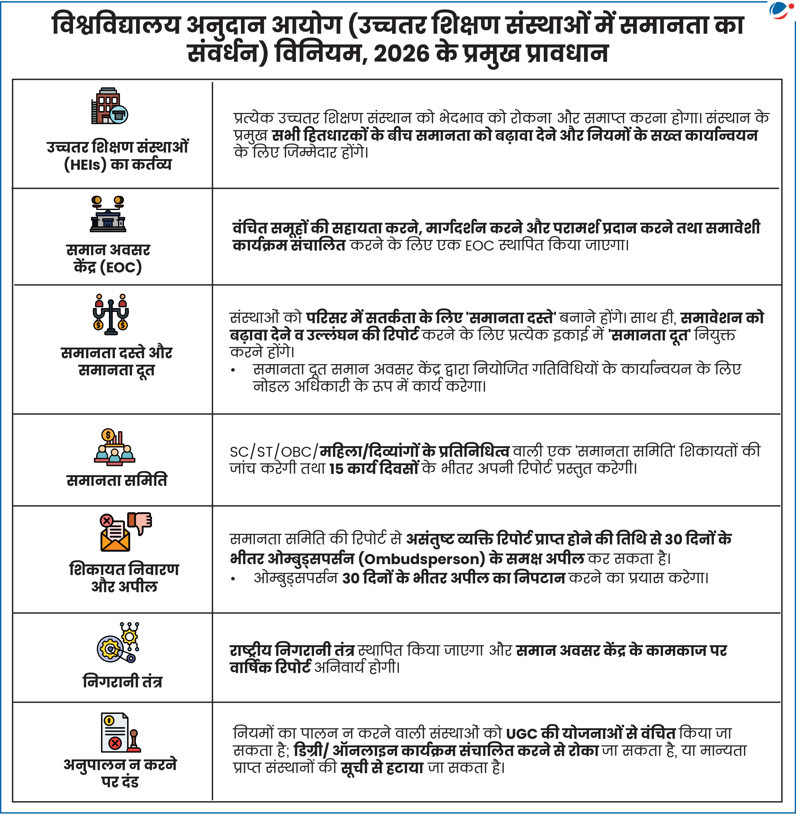 - UGC के नए विनियमों का उद्देश्य उच्चतर शिक्षा में जाति, धर्म, लिंग, नस्ल, जन्म स्थान या दिव्यांगता के आधार पर भेदभाव को समाप्त करना है। यह प्रावधान विशेष रूप से अनुसूचित जाति (SC), अनुसूचित जनजाति (ST), अन्य पिछड़ा वर्ग (OBC), आर्थिक रूप से कमजोर वर्ग (EWS) और दिव्यांग व्यक्तियों के लिए लागू होगा।