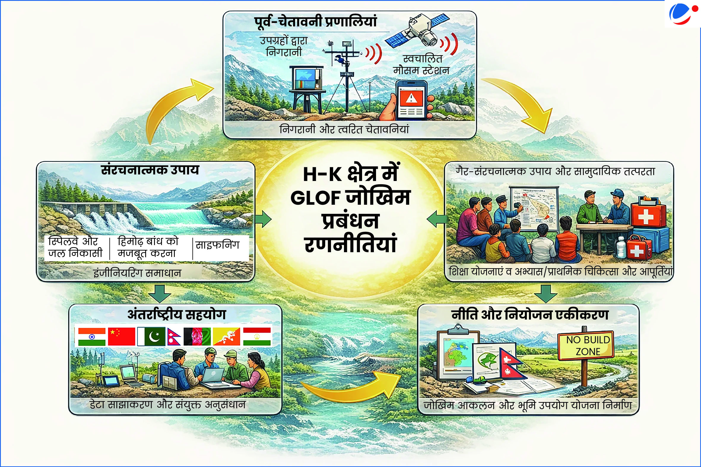 • हिमनदी झीलों के पास रहने वाले लगभग दस लाख लोगों के लिए ग्लोफिल्ड फ्लॉक्स (GLOFs) खतरा पैदा करते हैं, बुनियादी ढांचे को नुकसान पहुंचाते हैं और देशों के बीच सीमा पार जोखिम पैदा कर सकते हैं।