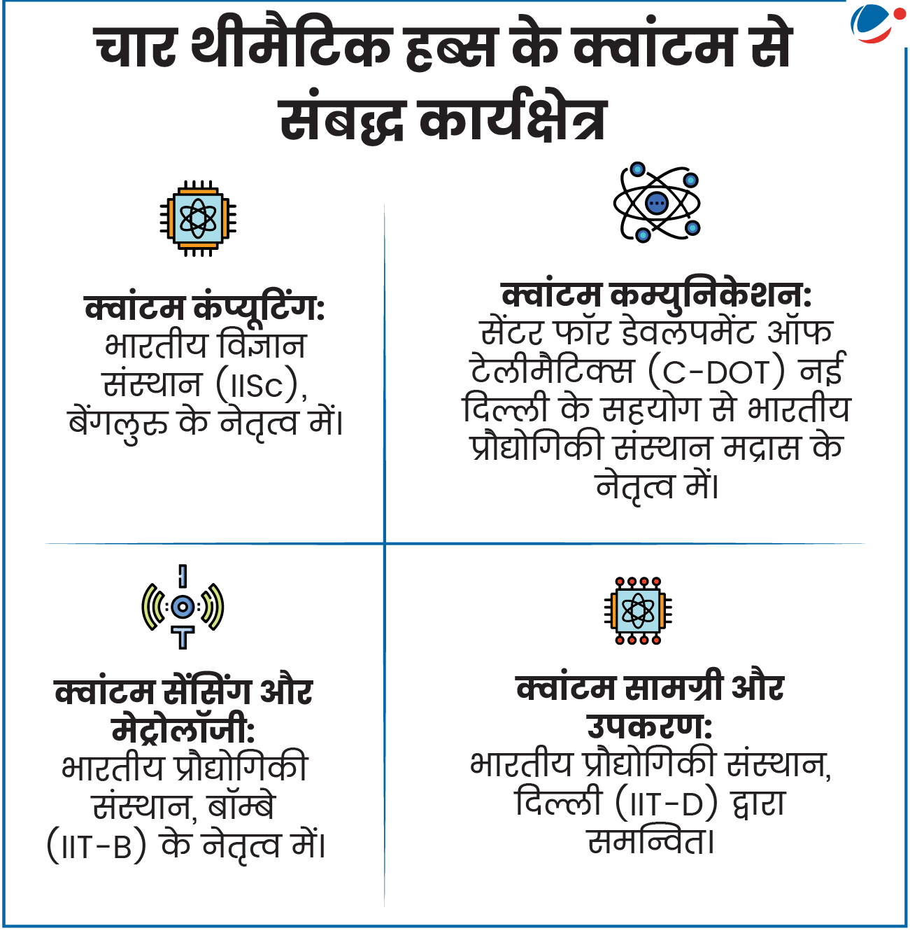 - लक्ष्य: क्वांटम प्रौद्योगिकी के क्षेत्रक में वैज्ञानिक और औद्योगिक अनुसंधान एवं विकास (R&D) को बढ़ावा देना, उसे पोषित करना तथा एक जीवंत एवं नवाचारी तंत्र तैयार करना।