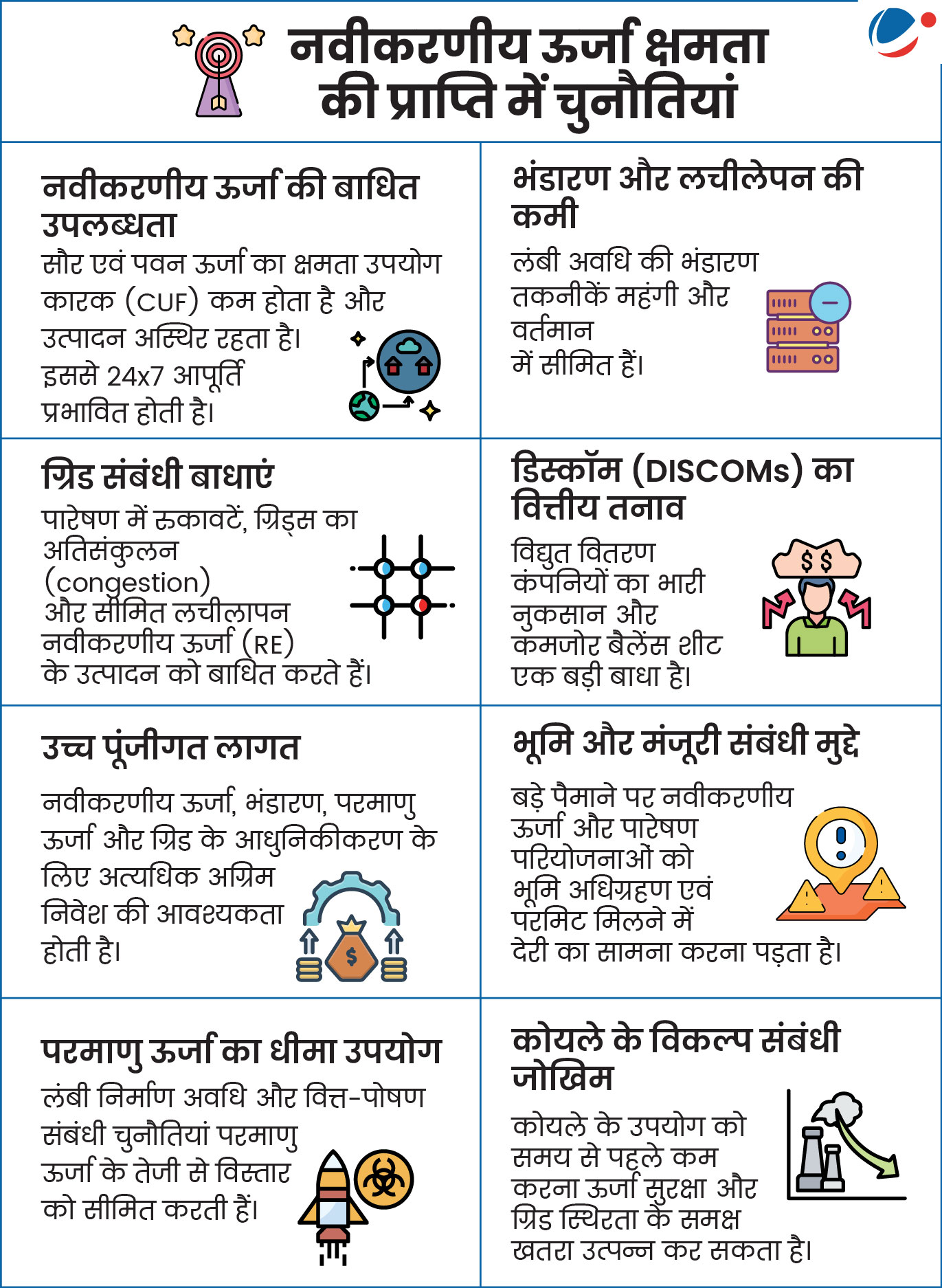 - नीतिगत और विनियामक सुधार: विद्युत बाजारों को और गहन करना चाहिए। वास्तविक लागत को व्यक्त करने वाले टैरिफ लागू करने चाहिए और नवीकरणीय ऊर्जा कार्यदेशों को मजबूत करना चाहिए। संसाधन पर्याप्तता योजना निर्माण को संस्थागत रूप देना चाहिए।