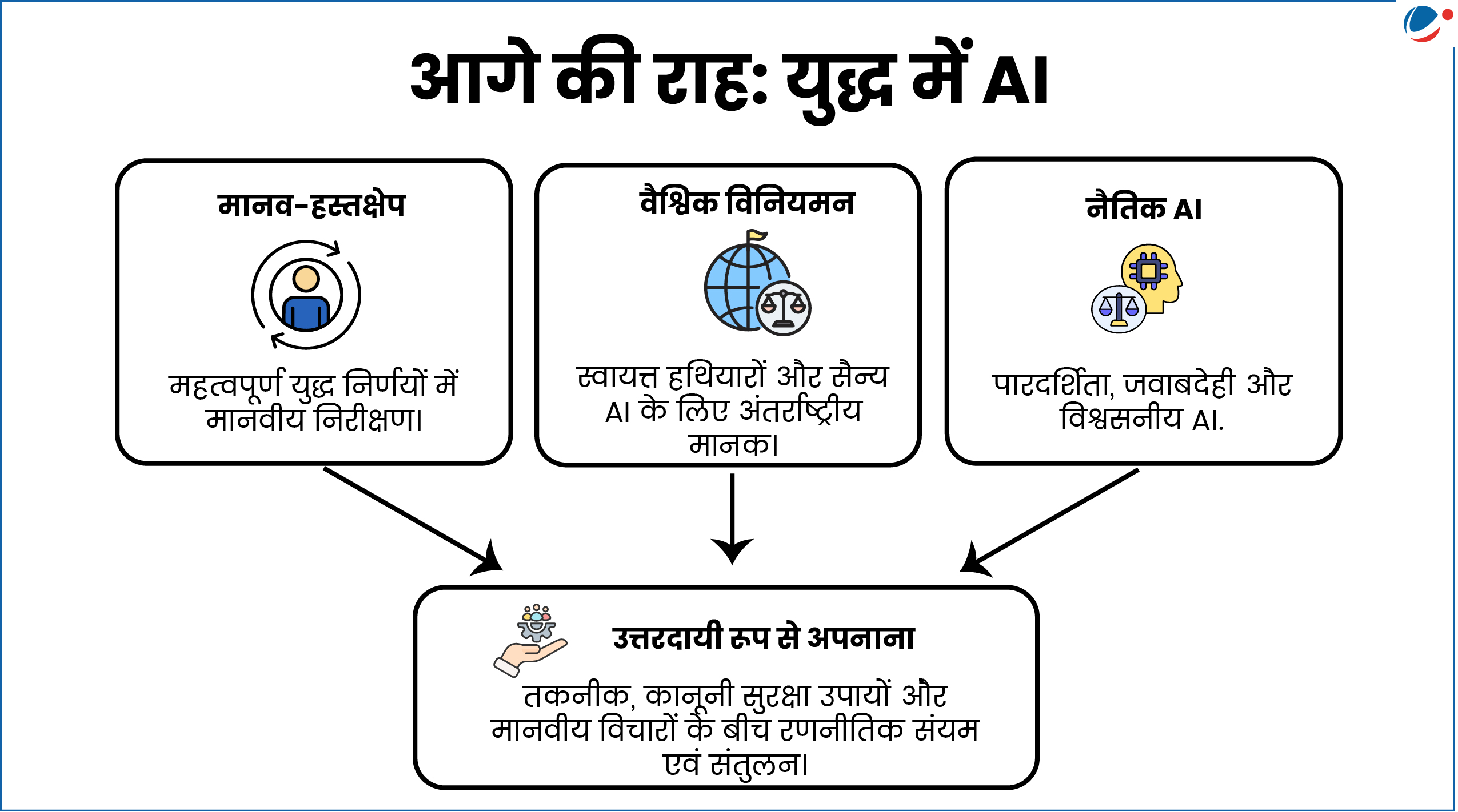 - इलेक्ट्रॉनिक युद्ध और साइबर ऑपरेशन: AI संकेतों का पता लगाने, शत्रु के संचार को बाधित करने तथा नेटवर्क की रक्षा करने में मदद करता है।