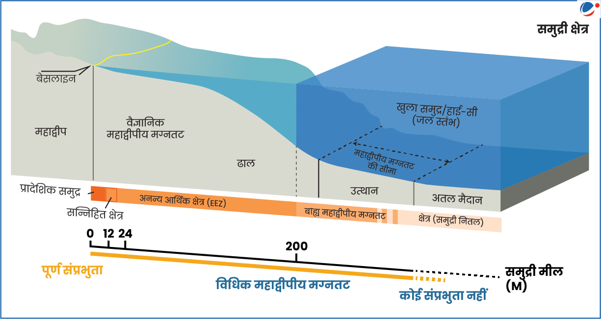 - समुद्री कानून पर संयुक्त राष्ट्र अभिसमय (UNCLOS): यह संधि 1994 में लागू हुई। यह संधि विश्व के महासागरों के लिए विधि और व्यवस्था की व्यापक रूपरेखा निर्धारित करने के साथ-साथ उन्हें समुद्री क्षेत्रों (maritime zones) में विभाजित करती है (इन्फोग्राफिक देखिए)।
