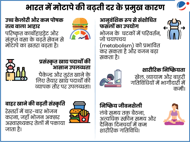 - उच्च प्रसार: अधिक वजन और मोटापे के साथ जी रहे बच्चों के मामले में भारत वैश्विक स्तर पर दूसरे स्थान पर है।