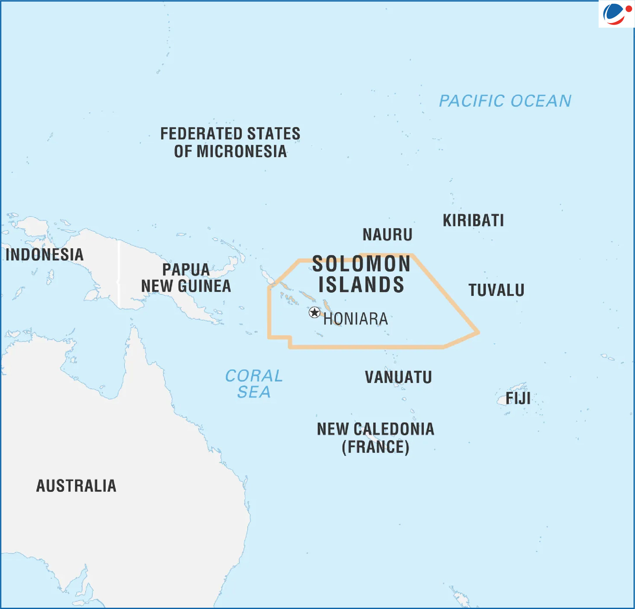 - यह पश्चिम में पापुआ न्यू गिनी और दक्षिण-पूर्व में वानुअतु के साथ समुद्री सीमाएं साझा करता है।