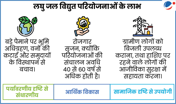 - भारत में 25 मेगावाट (MW) या उससे कम क्षमता वाले जल विद्युत संयंत्रों को 'लघु जलविद्युत' (Small Hydro) के रूप में वर्गीकृत किया गया है।