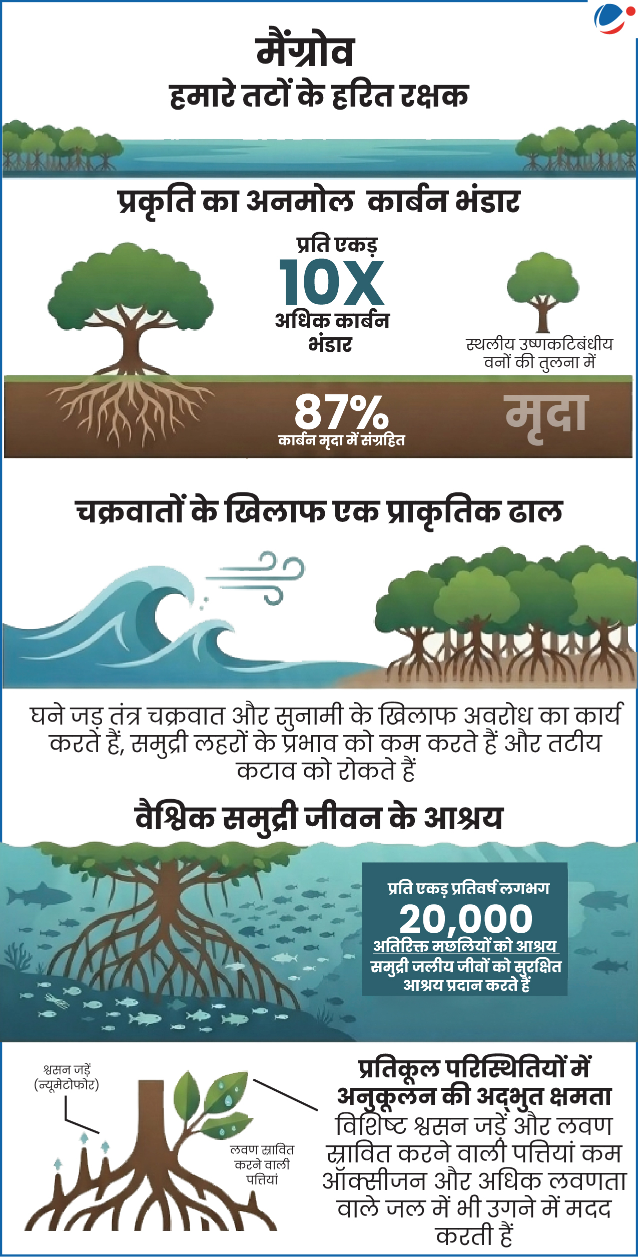 - परिभाषा: मैंग्रोव लवण-सहिष्णु पादपों के समूह हैं। ये उष्णकटिबंधीय और उपोष्णकटिबंधीय ज्वारीय क्षेत्रों में उगते हैं, जहां भूमि और समुद्र मिलते हैं।