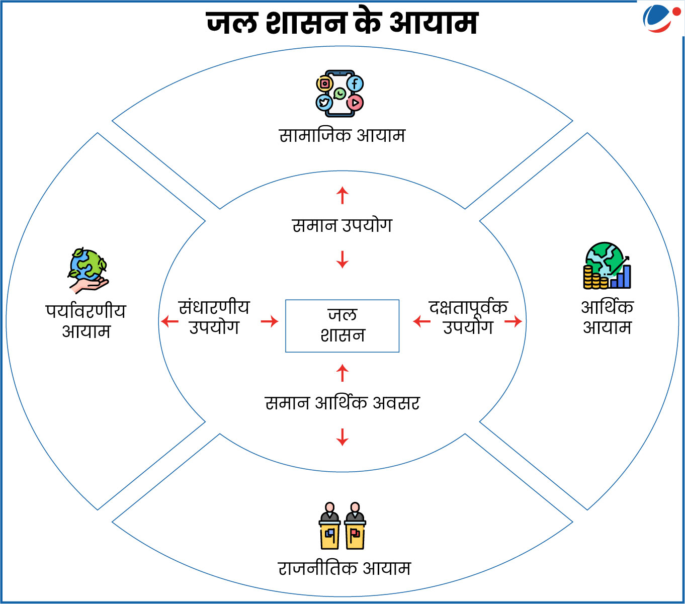 - उदाहरण के लिए: जन भागीदारी— ग्राम पंचायतों और गांव समितियों को स्थानीय जल प्रणालियों के प्रबंधन के लिए सशक्त बनाती है।