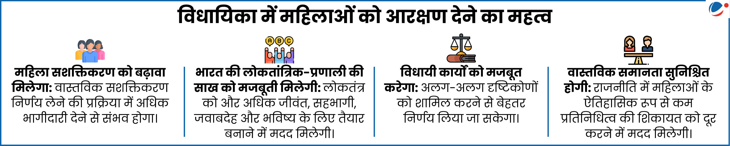 - इसके अलावा, इस मुद्दे पर चर्चा आगे बढ़ाने के लिए आने वाले दिनों में संसद का सत्र बुलाने का निर्णय लिया गया है, क्योंकि और देरी महिला आरक्षण की दिशा में हुई प्रगति की गति को बाधित कर सकती है।