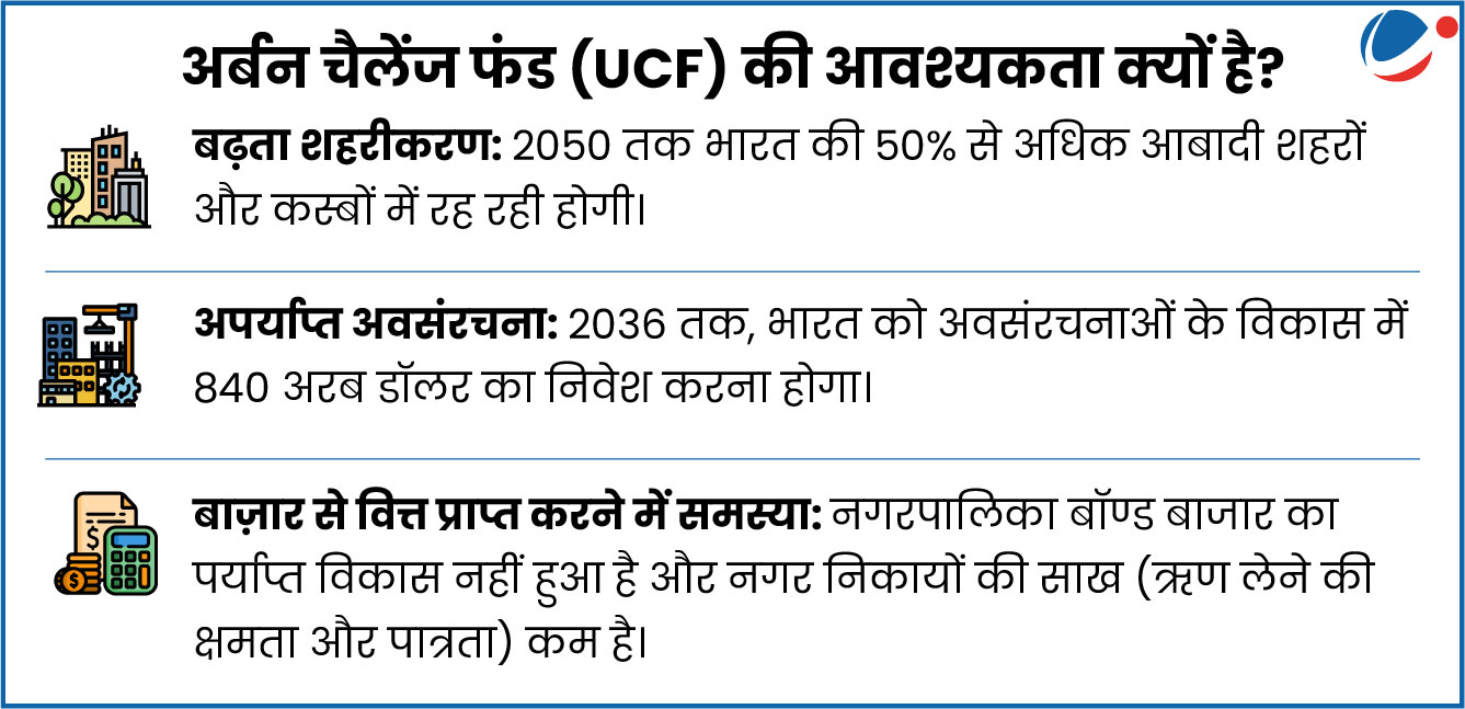 - अर्बन चैलेंज फंड का उद्देश्य बेहतर शहरी अवसंरचनाओं के विकास के लिए बाजार से धन जुटाना, निजी भागीदारी बढ़ाना और नागरिक-केंद्रित सुधार करना है।