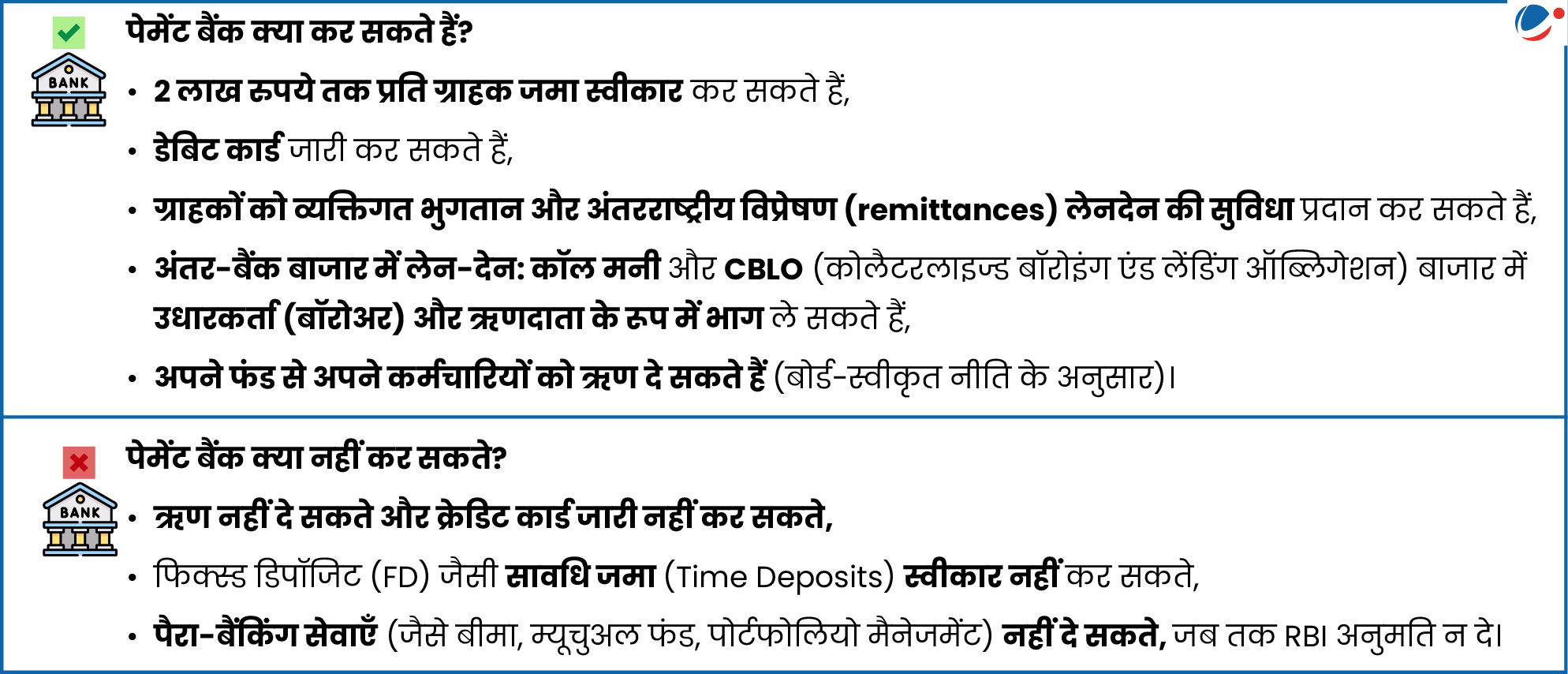 - परिभाषा: पेमेंट बैंक एक ऐसा वित्तीय संस्थान होता है जिसे छोटे स्तर पर कार्य करने और कम जोखिम (खासकर लोन न देने के कारण) के लिए स्थापित किया जाता है। इसे डिफरेंशिएटेड बैंकिंग लाइसेंस (DBL) के तहत स्थापित किया जाता है।