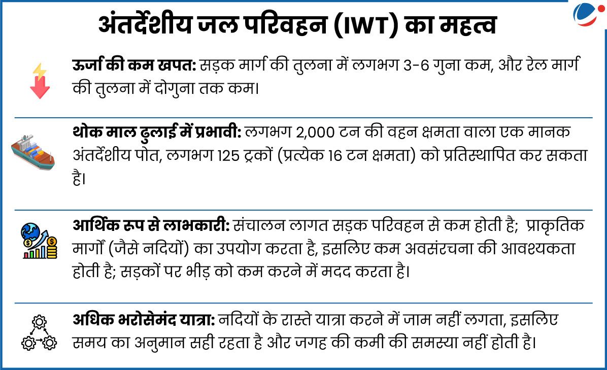 - लक्ष्य: 'मैरीटाइम अमृत काल विजन' के अनुसार, भारत का लक्ष्य कुल माल ढुलाई में अंतर्देशीय जल परिवहन (IWT) की हिस्सेदारी को 2% से बढ़ाकर 5% करना है। साथ ही, अंतर्देशीय जलमार्गों से होकर वर्ष 2030 तक 200 मिलियन मीट्रिक टन और 2047 तक 500 मिलियन मीट्रिक टन से अधिक माल ढुलाई का लक्ष्य रखा गया है।