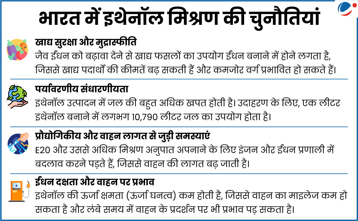 - कार्बन उत्सर्जन में कमी: नीति आयोग के एक अध्ययन के अनुसार, गन्ने और मक्के से तैयार इथेनॉल पेट्रोल की तुलना में ग्रीनहाउस गैस (GHG) उत्सर्जन को क्रमशः 65% और 50% तक कम करते हैं।