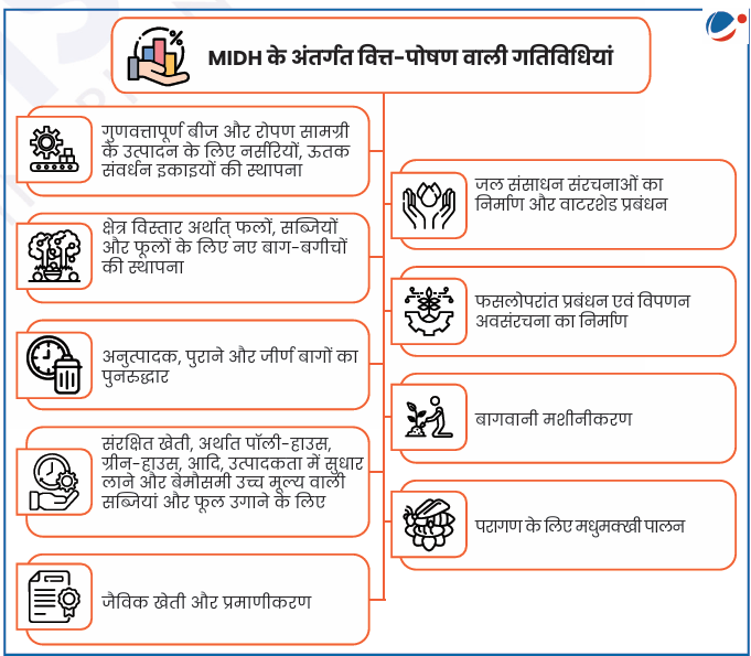 • पूर्वोत्तर और हिमालयी राज्यों के लिए बागवानी मिशन (HMNEH): यह एक तकनीकी मिशन है, जो गुणवत्तापूर्ण रोपण सामग्री के उत्पादन, जैविक कृषि, कुशल जल प्रबंधन इत्यादि पर केंद्रित है।