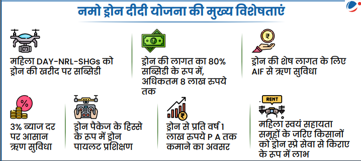 • उद्देश्य: कृषि सेवाएं प्रदान करने के लिए ड्रोन प्रौद्योगिकी से लैस महिला-नेतृत्व वाले स्वयं सहायता समूहों (SHGs) को सशक्त बनाना।