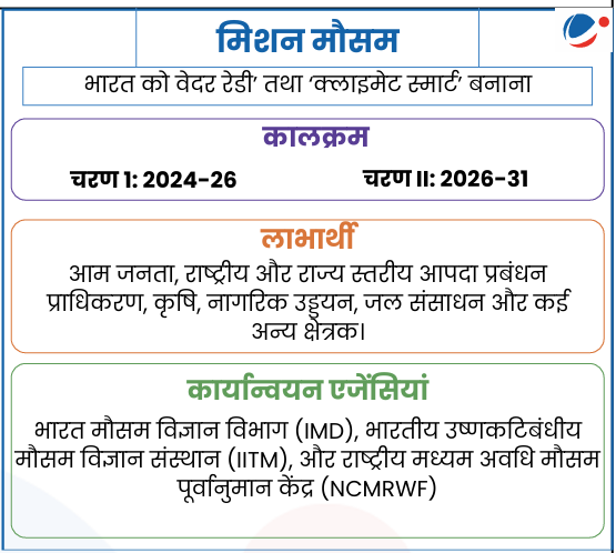 • लक्ष्य: भारत को मौसम और जलवायु विज्ञान में वैश्विक अग्रणी के रूप में स्थापित करना, और भारत को वैश्विक मानकों के अनुरूप 'वेदर रेडी' तथा'क्लाइमेट स्मार्ट' बनाना।