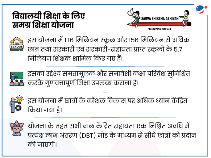 • पृष्ठभूमि: समग्र शिक्षा योजना विद्यालयी शिक्षा क्षेत्रक हेतु प्री-स्कूल से लेकर 12वीं कक्षा तक के लिए एक व्यापक कार्यक्रम है।
