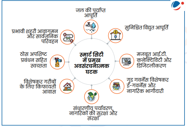 - पृष्ठभूमि: स्मार्ट सिटीज़ मिशन को 25 जून, 2015 को शुरू किया गया था। इस मिशन का उद्देश्य दक्ष सेवाओं, मजबूत अवसंरचना और टिकाऊ समाधानों के माध्यम से100 शहरों में जीवन की गुणवत्ता को बढ़ाना है। इसमें आवास, परिवहन, शिक्षा, स्वास्थ्य सेवा और मनोरंजन को ध्यान में रखकर आदर्श शहरी स्थान तैयार करना शामिल है।