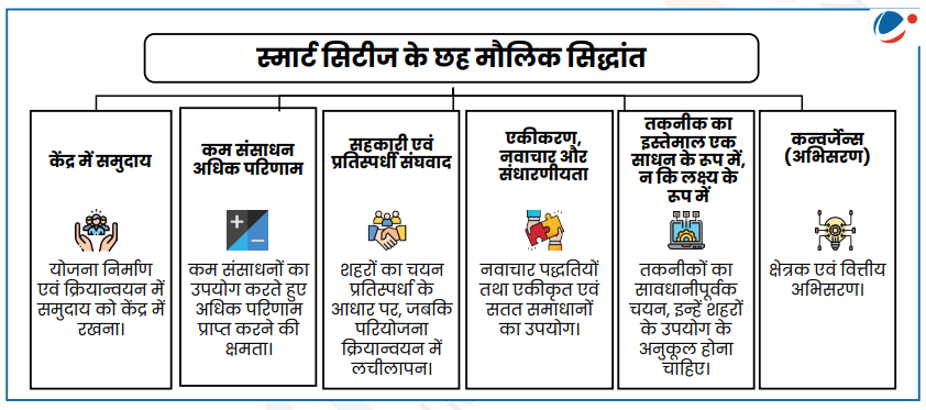 - स्मार्ट सिटीज़ मिशन का दृष्टिकोण: मिशन का कार्यान्वयन मुख्य रूप से दो दृष्टिकोणों के माध्यम से किया जाता है: