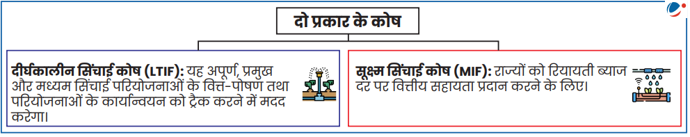- समर्पित कोष: राष्ट्रीय कृषि और ग्रामीण विकास बैंक (नाबार्ड) के तत्वावधान में समर्पित एक दीर्घकालीन सिंचाई निधि (LTIF) और सूक्ष्म सिंचाई कोष (MIF)।