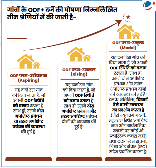 • SBM ODF+: ODF दर्जे को यथावत बनाए रखने के साथ-साथ यह सुनिश्चित करना कि सभी सामुदायिक और सार्वजनिक शौचालय कार्यशील व सुव्यवस्थित हों।
