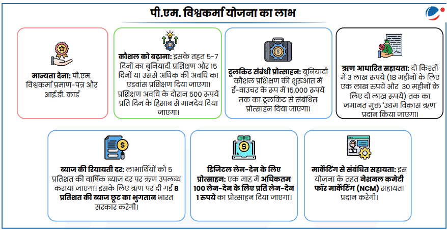 • इस योजना के तहत कारीगरों और शिल्पकारों को विश्वकर्मा कर्मियों के रूप में मान्यता देना और कौशल उन्नयन प्रदान करना