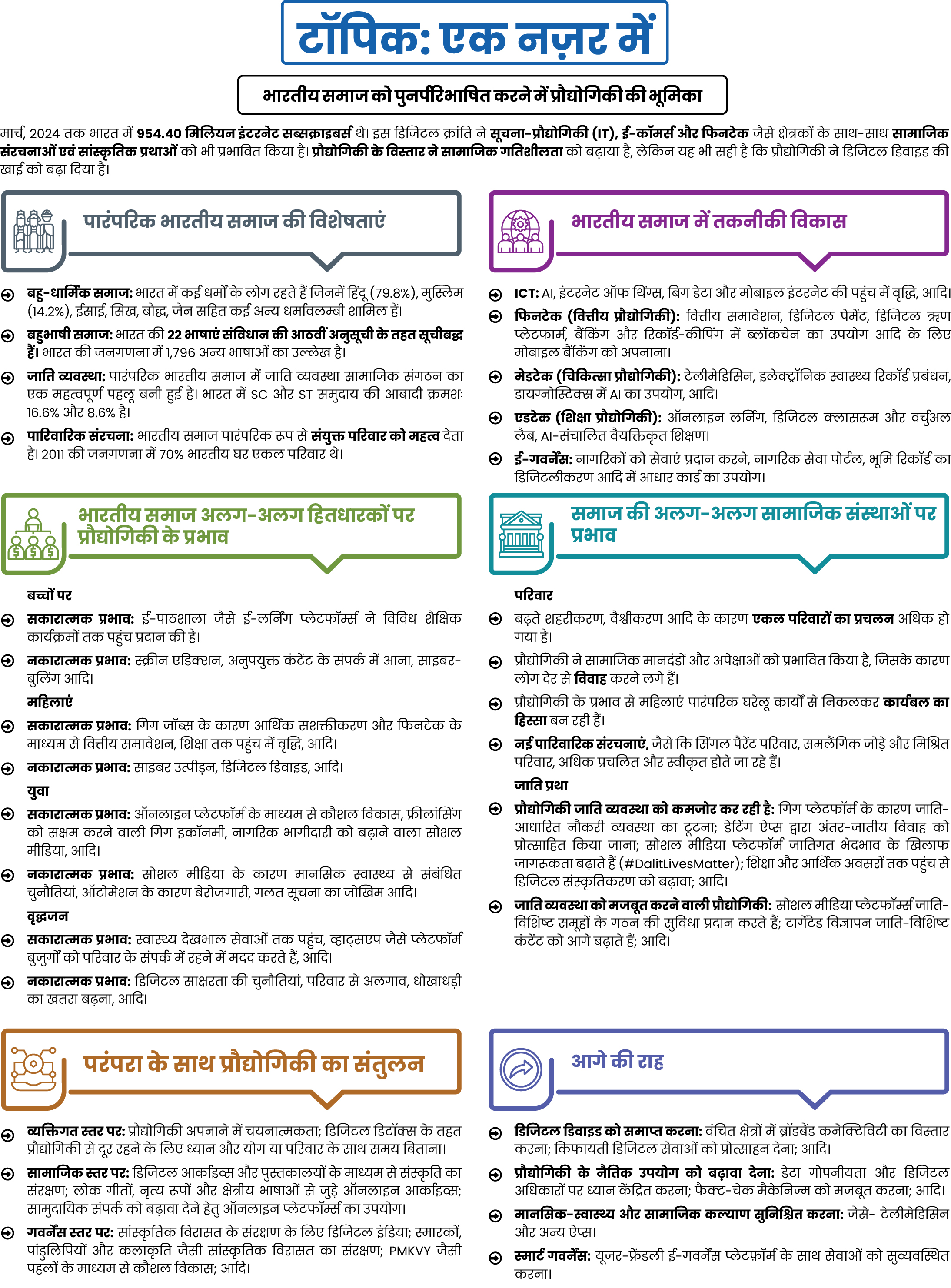 प्रौद्योगिकी ने भारत की सामाजिक संरचनाओं को प्रभावित किया है, सांस्कृतिक प्रथाओं में परिवर्तन लाया है तथा सामाजिक संस्थाओं और मूल्य प्रणालियों को नई दिशा दी है। इसमें कोई दो राय नहीं कि, प्रौद्योगिकी के विस्तार ने सामाजिक गतिशीलता को बढ़ाया है और पहले से हाशिए पर मौजूद समूहों को सशक्त बनाया है। लेकिन यह भी सही है कि प्रौद्योगिकी ने डिजिटल डिवाइड की खाई को बढ़ा दिया है तथा पारिवारिक संरचना और सांस्कृतिक मानदंडों में बदलाव जैसी चुनौतियां भी पैदा की हैं।