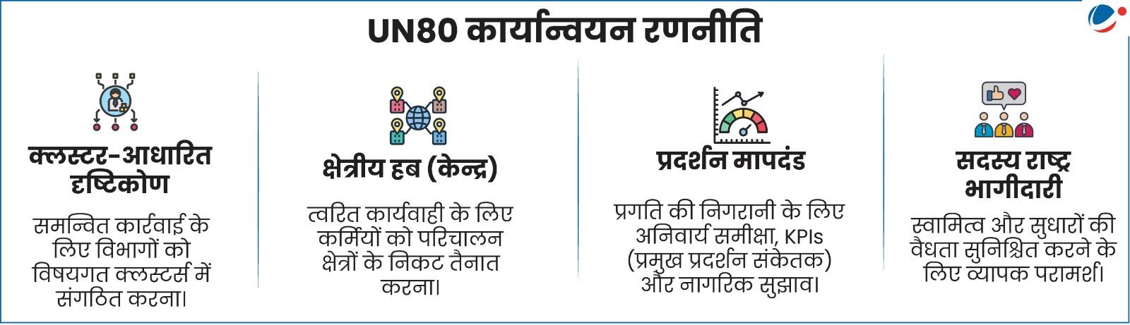 - UN@80 पहल- 2025: मार्च 2025 में शुरू की गई यह पहल पूरे संयुक्त राष्ट्र सिस्टम में सुधार लाने के लिए बनाई गई है। इसका उद्देश्य है — बहुपक्षवाद को मजबूत करना; कामकाजी दक्षता और जवाबदेही बढ़ाना; आधुनिक चुनौतियों के अनुरूप बदलाव लाना और वित्तीय स्थिरता सुनिश्चित करना है। इसमें तीन मुख्य कार्यक्षेत्र शामिल हैं: