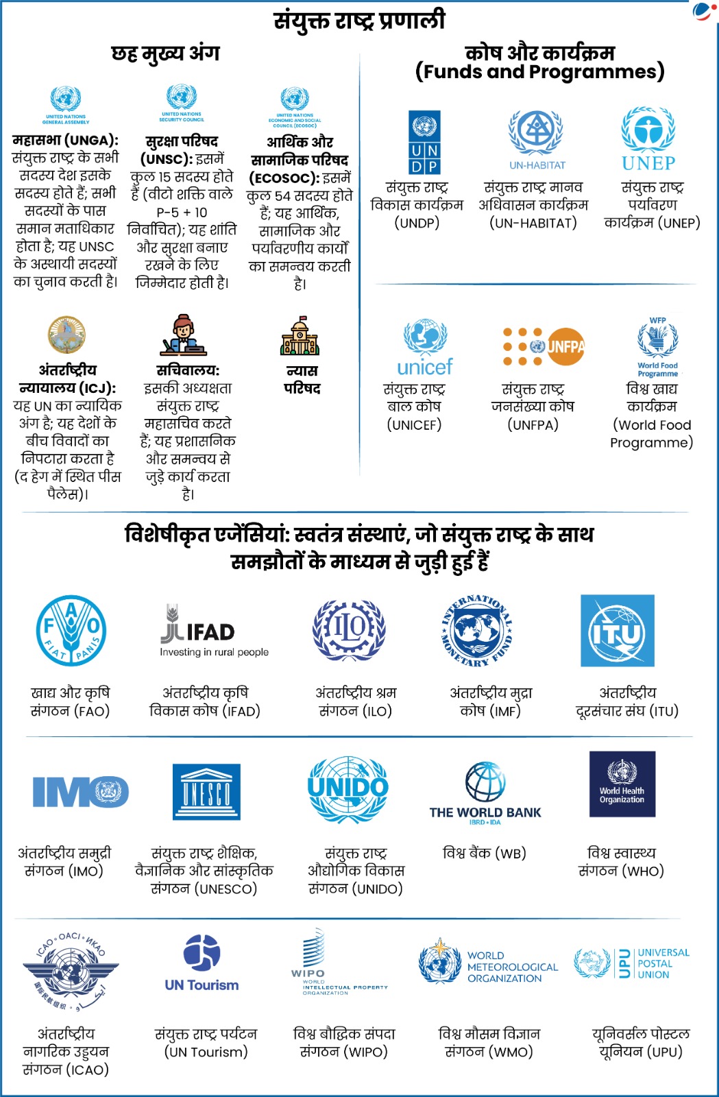 - कार्य-प्रणाली: यह संयुक्त राष्ट्र प्रणाली का हिस्सा है, जिसमें संयुक्त राष्ट्र के अलावा, इसके छ: प्रमुख अंग, कई कोष, कार्यक्रम और विशेषीकृत एजेंसियां (इन्फोग्राफिक देखें) शामिल हैं। इनमें से प्रत्येक अंग का अपना अलग कार्यक्षेत्र, नेतृत्व और बजट होता है।