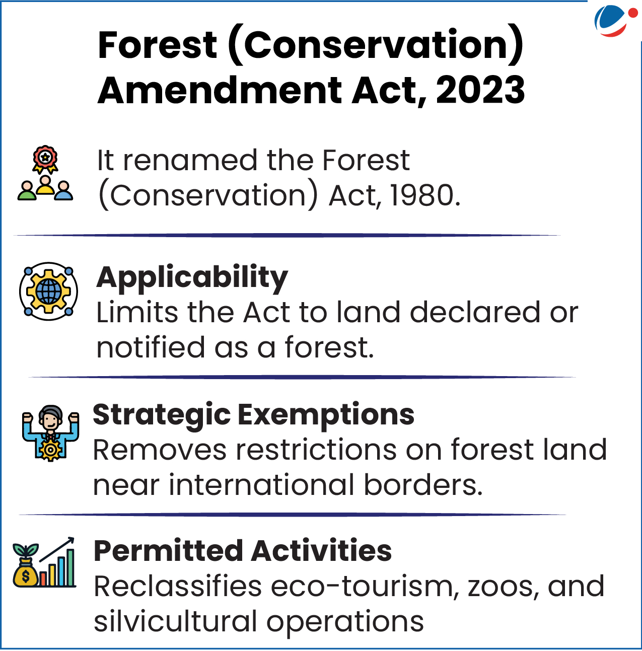 - It allows assisted natural regeneration including afforestation/plantation, carried out by Government or non-Government entities to be treated as “forestry activities”.