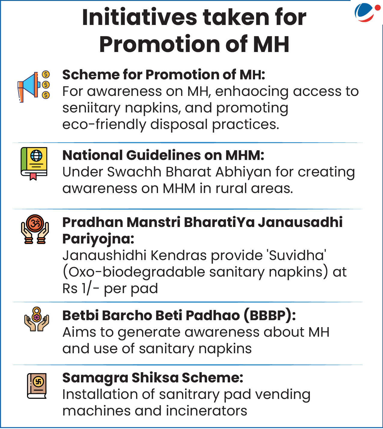 - Mandatory institutional measures: All schools must provide sensitization of male teachers and students, gender-segregated toilets, free sanitary napkins (preferably through vending machines), and dedicated MHM corners.