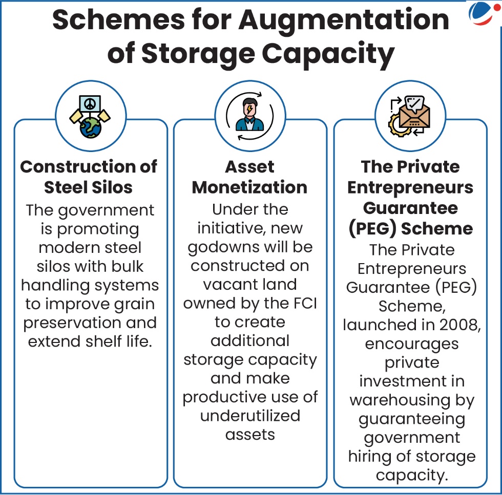 - Supporting Public Distribution System (PDS): Strong storage infrastructure is required for smooth distribution of grains to millions of beneficiaries under food security programmes.
