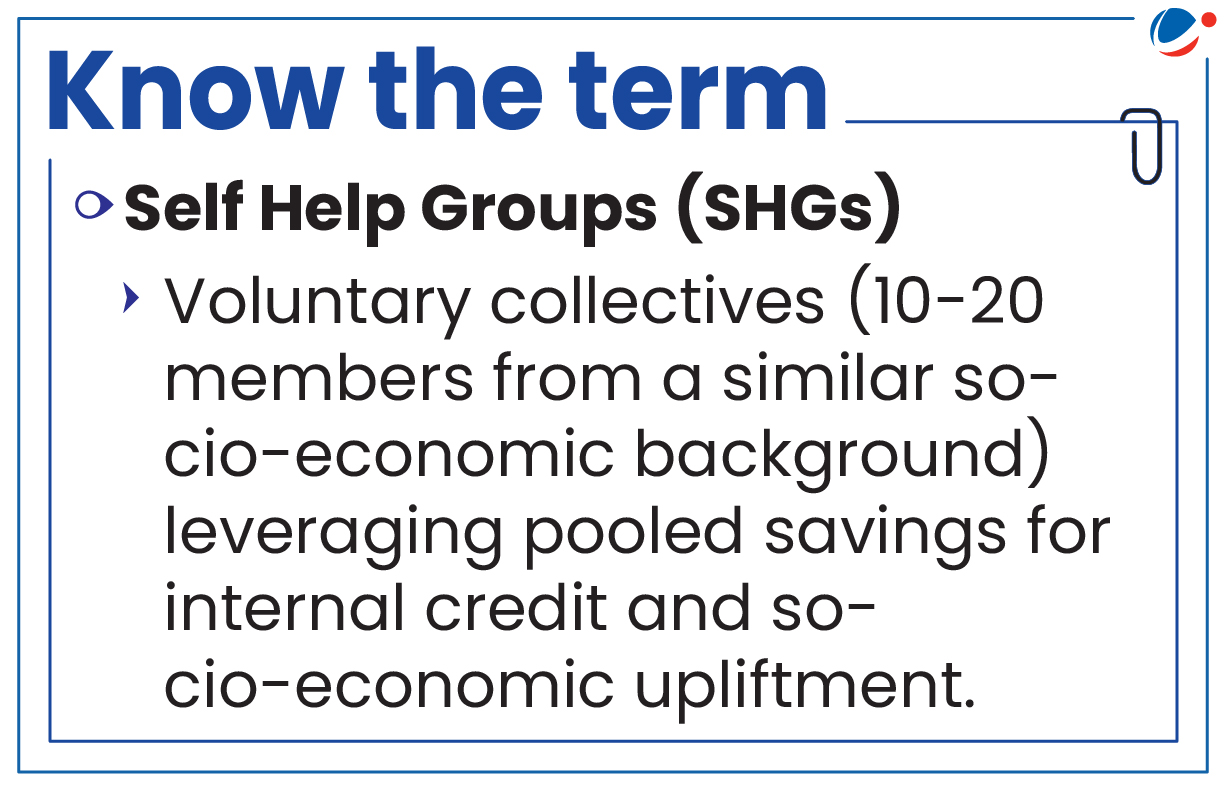 - Strengthen Access to Finance: Expansion of Business Correspondent (BC) Sakhis providing doorstep banking has improved credit access for SHGs and reduced loan NPAs to around 1.76%. (Rural Development Ministry).