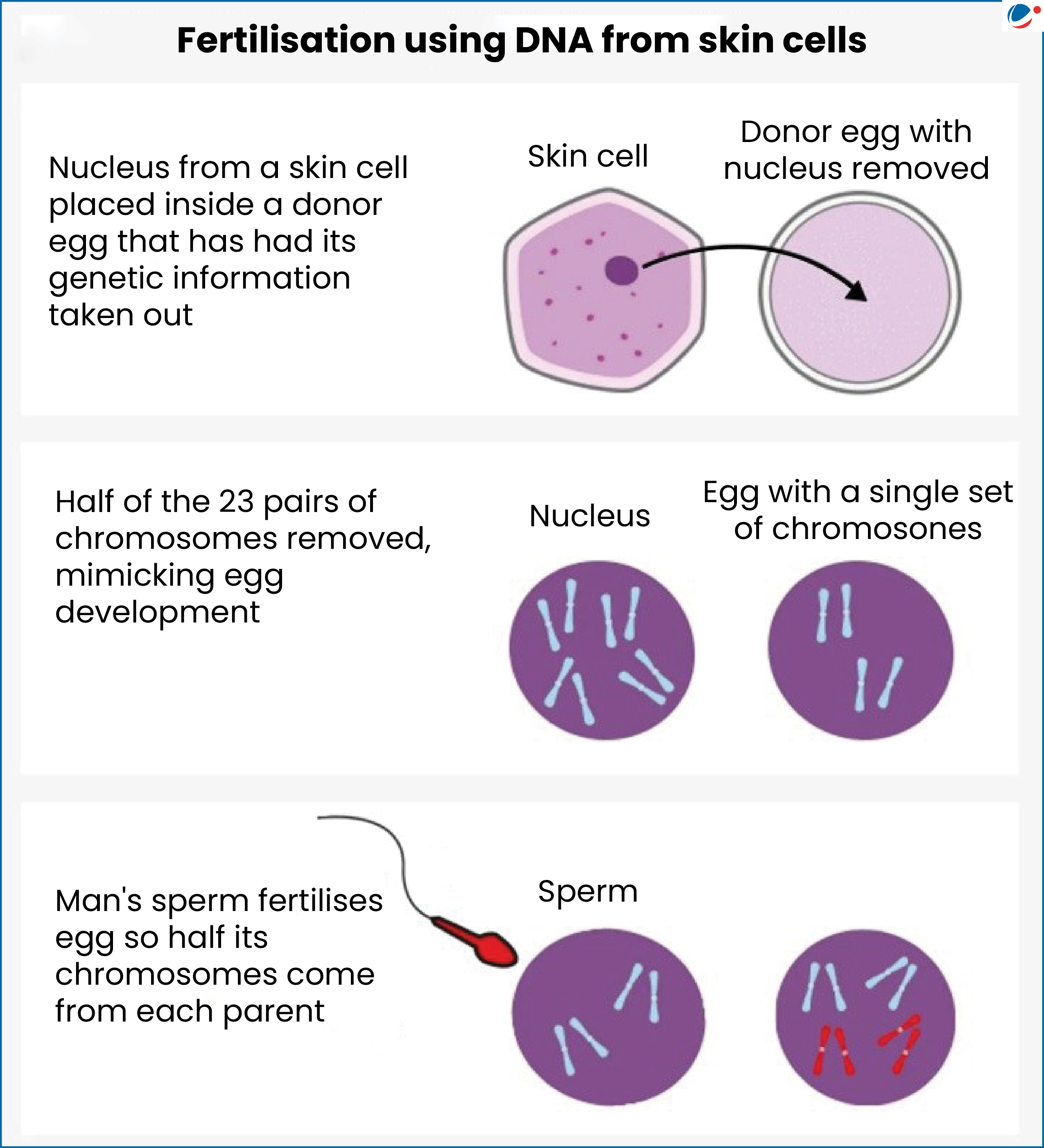 - To remove extra 23 chromosomes from derived eggs, researchers devised a technique called “mitomeiosis”, mimicking natural cell division in a way that causes one set of 23 chromosomes to be discarded.