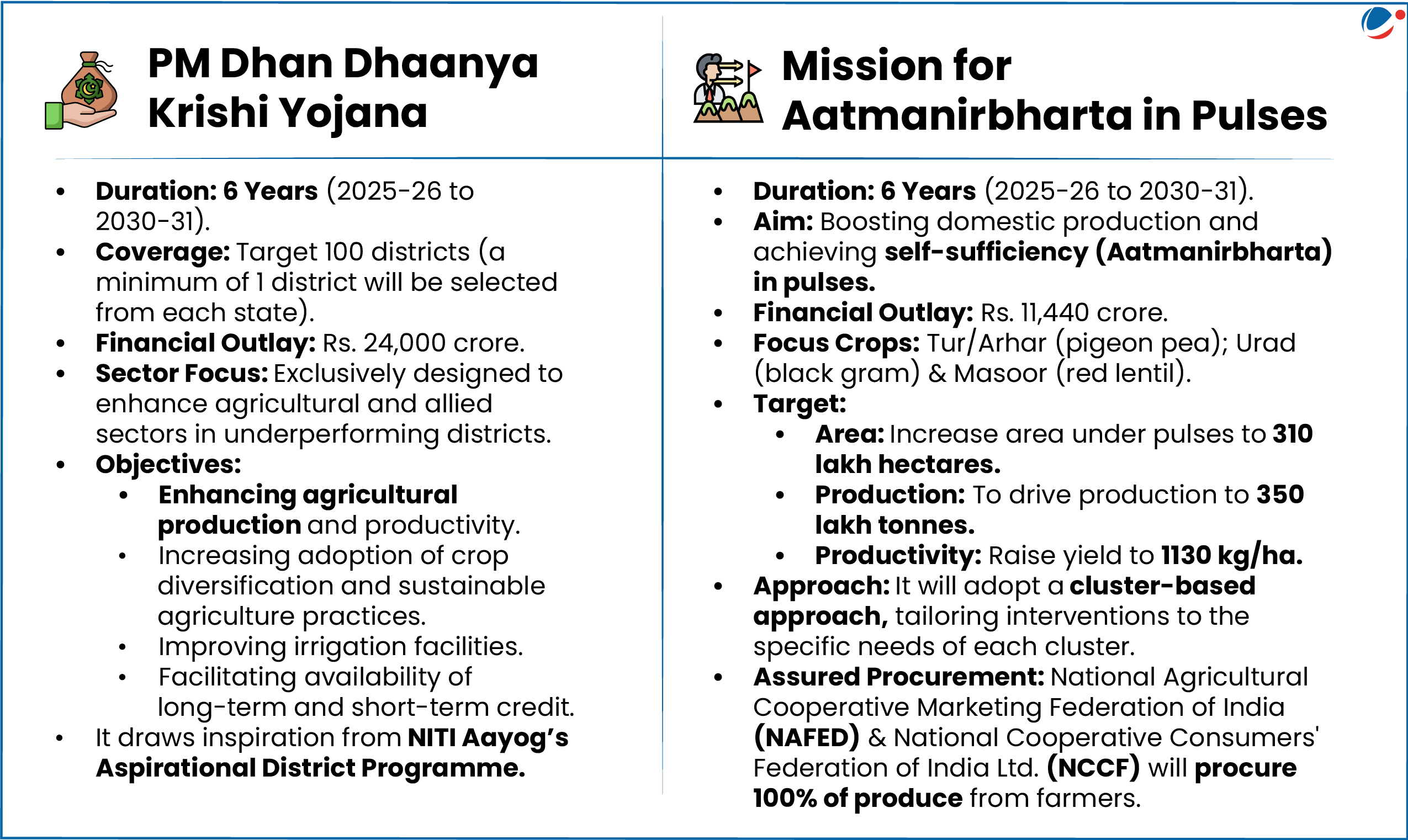 The Prime Minister launched two major schemes in the agriculture sector I.e., PM Dhan Dhaanya Krishi Yojana and Mission for Aatmanirbharta in Pulses.