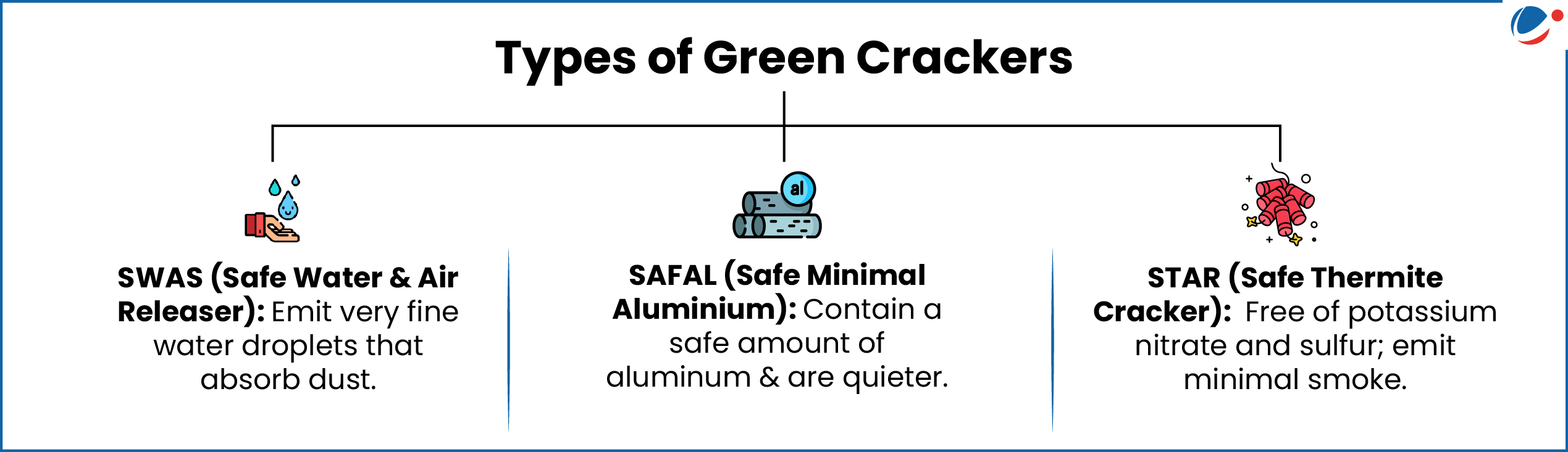 - Developed by CSIR–NEERI, green crackers are designed to reduce environmental impact compared to traditional fireworks.